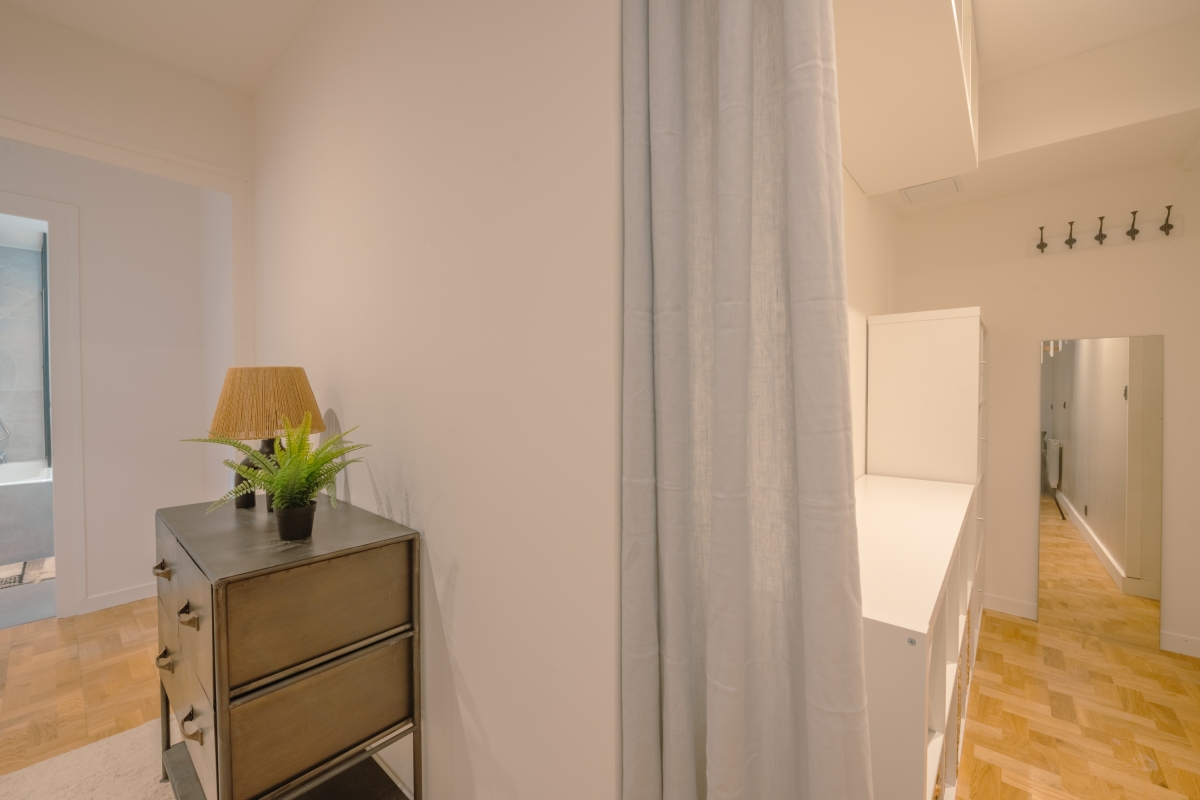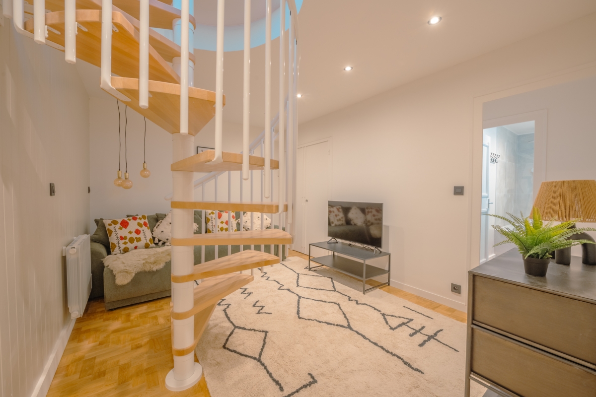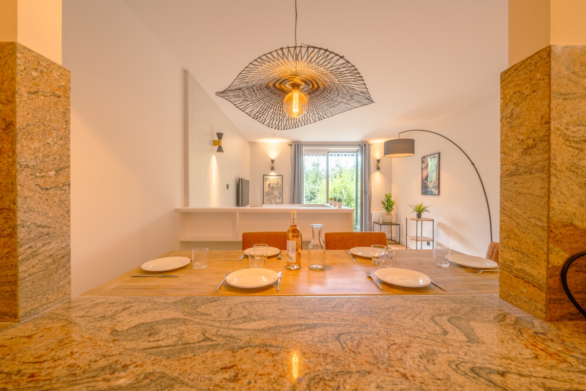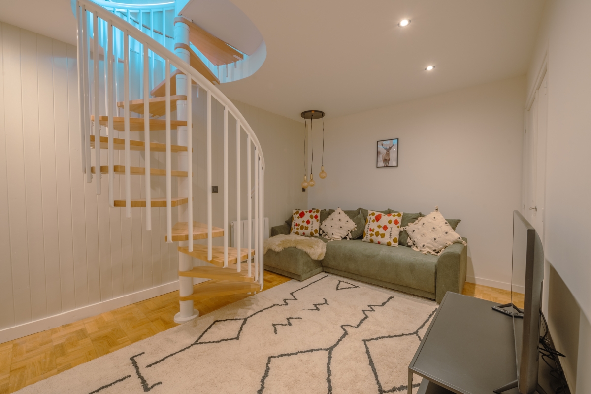 The apartment offers two living areas, one on each floor, both are equipped with stylish sofa seating areas and flat-screen TVs. There is also a Play Station and a flat-screen TV for entertainment. The separate kitchen is fully equipped with a dishwasher, oven, microwave, fridge, toaster, and american style coffee machine for a carefree holiday. The dining area is separate from the kitchen and sits 6 people with a lovely wooden table and comfy upholstered chairs.