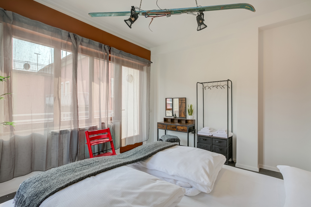 Bedroom 1: A stylish balcony bedroom with a double bed and a wardrobe.