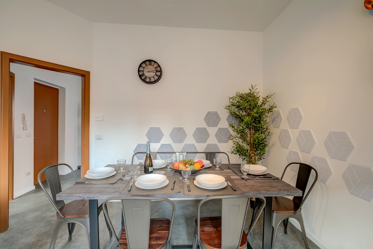 The stylish living room has an open layout featuring a modern decor complete with sofa seating and a lounge chair, which is further complemented by entertainment facilities and amenities like a books and games library, HD TV, Hotbird and Wi-Fi. This room also leads out directly onto the lovely balcony where you can enjoy your morning coffee or an afternoon aperitif. Back inside again, you’ll find the apartment’s fully-equipped kitchen-dining area with a dishwasher, microwave, oven, moka coffee machine and toaster available, among other utilities.
