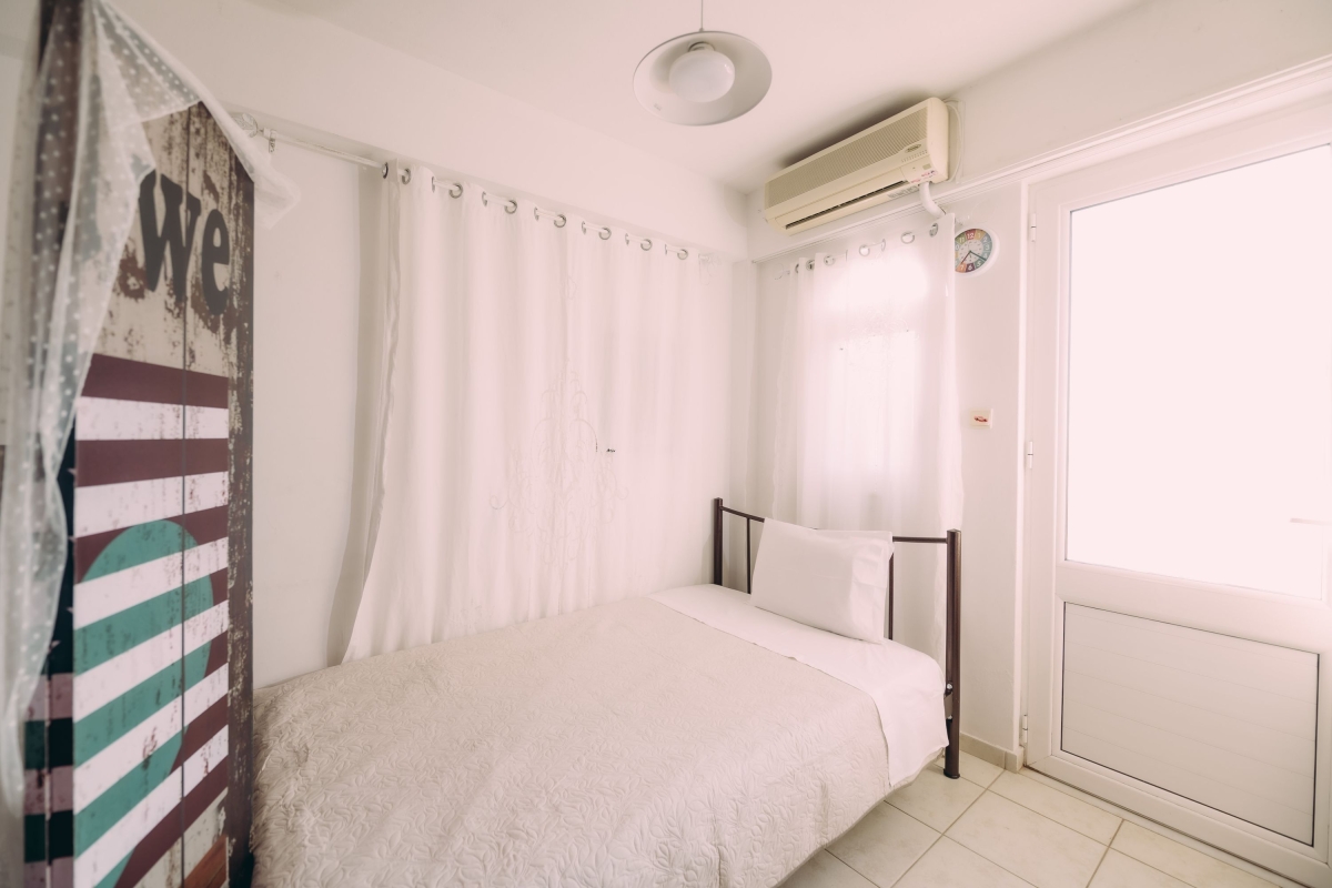 Bedroom 2: The second bedroom is furnished with a single sofa bed and a wardrobe. This room also enjoys access to a balcony