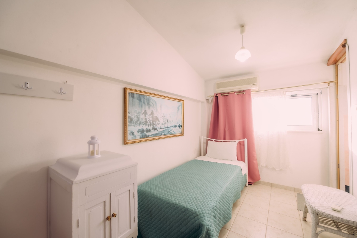 Quietly located on a hillside with views over the surrounding countryside this simple holiday escape is arranged over three floors and can sleep up to six guests. The property enjoys air-conditioning, a small balcony with a table and chairs, and the use of a shared garden. The small open-plan living area enjoys a comfortable sofa, smart flat-screen TV and incorporates both the kitchen and a small dining area. The kitchen is fitted with; a cooker hob, a coffee machine, an oven and a fridge freezer.