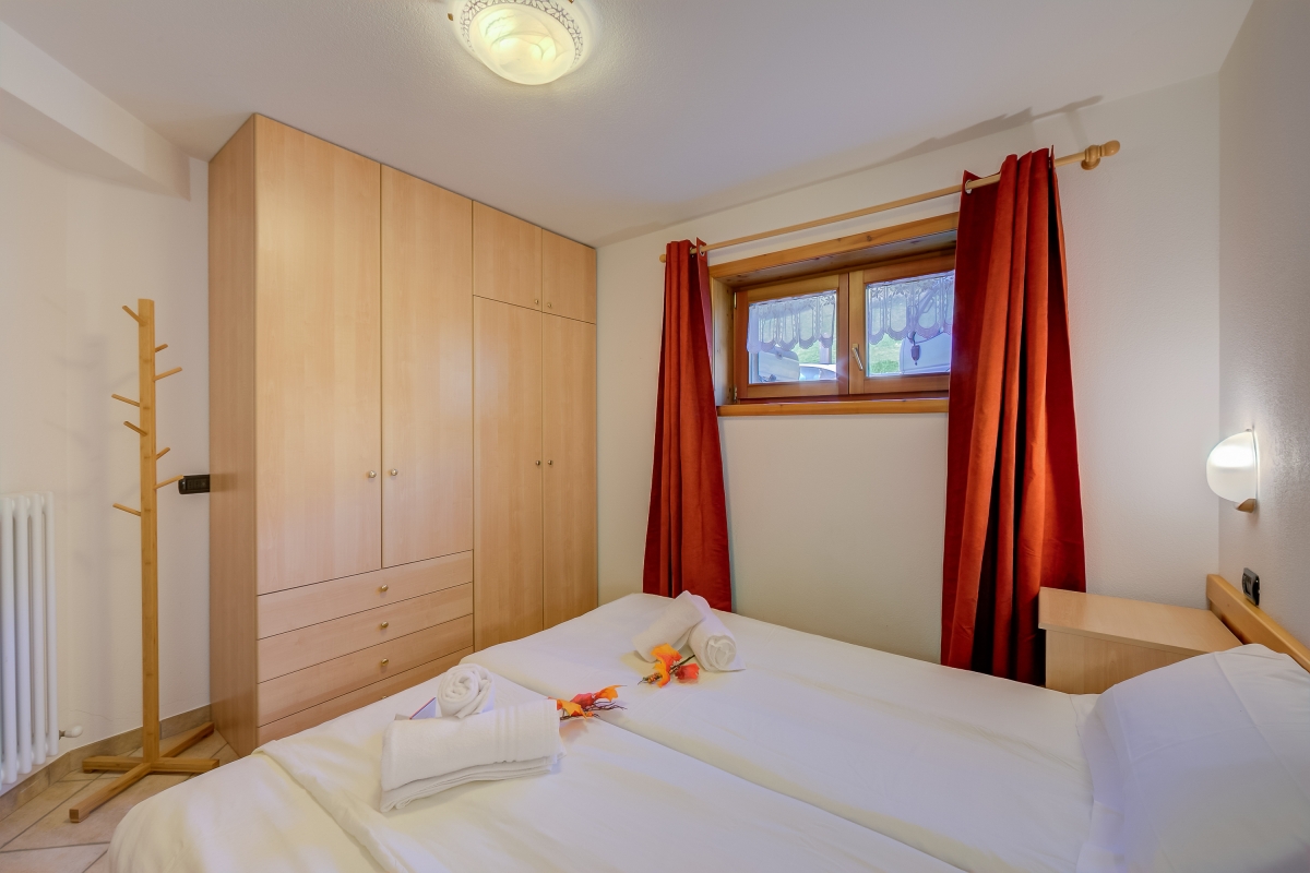 Bedroom 1: This bedroom is built into the hillside and has a high window. It is furnished with joinable single beds and a wardrobe.