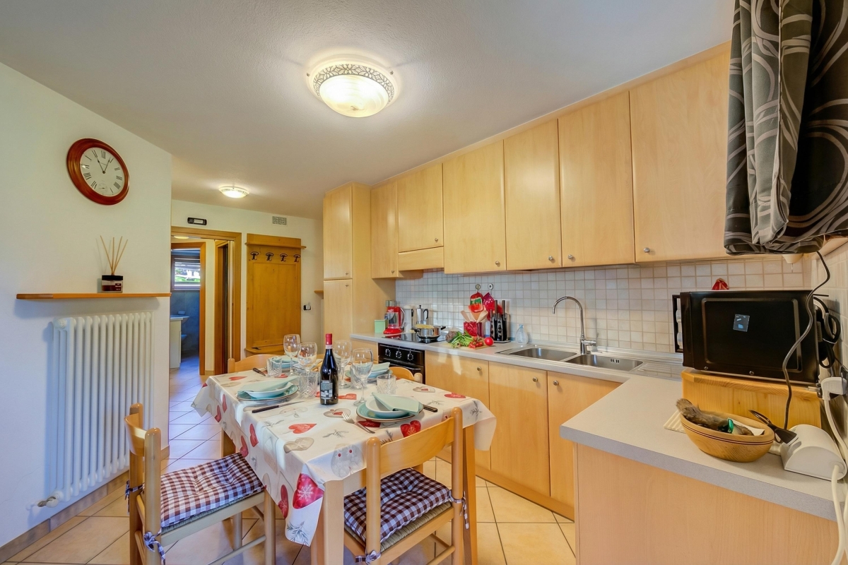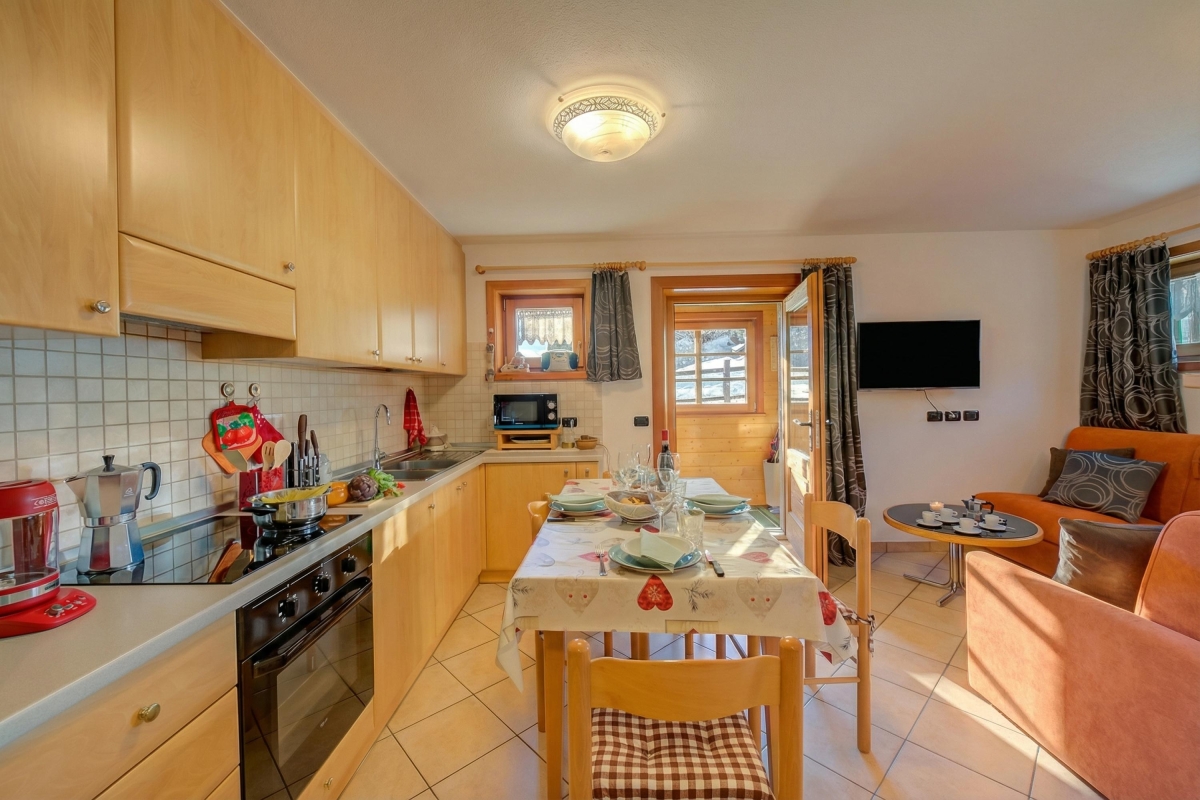 This peaceful chalet sleeps 6 people. The entrance is down a small flight of steps and into a cosy entrance hall. The open-plan living area is conveniently furnished with everything you need for a comfortable stay. There is a corner sofa, flat-screen TV, coffee table and dining table with chairs, next to the open kitchen. The fitted kitchen is fully equipped with an induction hob, oven, dishwasher, microwave, fridge/freezer and coffee machine.