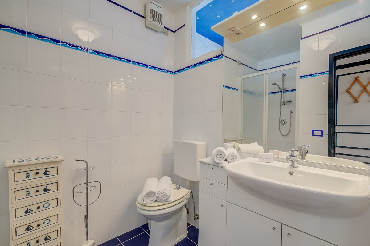 The main living and dining room has high arched ceilings with some original brickwork. Large windows open out over the sea. On the other side, French windows look out over the pedestrian street. The seating area has an attractive corner sofa, two armchairs and a flat-screen TV. A stylish spiral staircase divides the room and at the other end is a dining table and chairs. The separate kitchen is full of light and equipped with a cooker hob, dishwasher, fridge, freezer and Italian coffee machine.