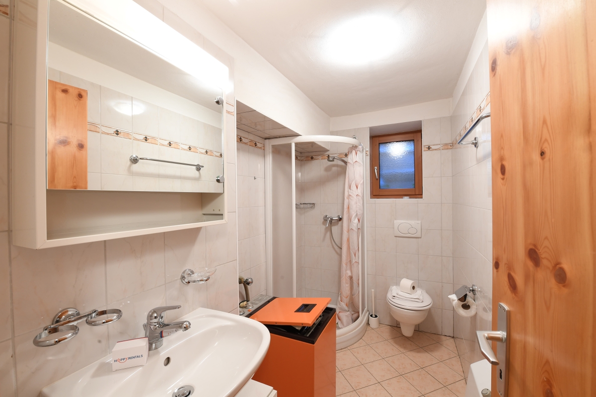 The tiled bathroom has a shower, basin, WC and washing machine.