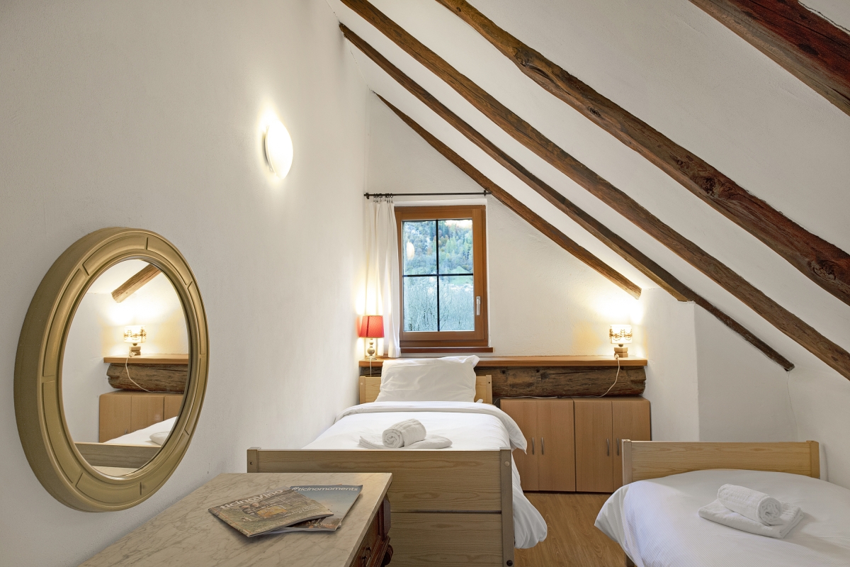 Bedroom 2: The second bedroom, which also has a pitched beamed ceiling, has two single beds and a wardrobe.
