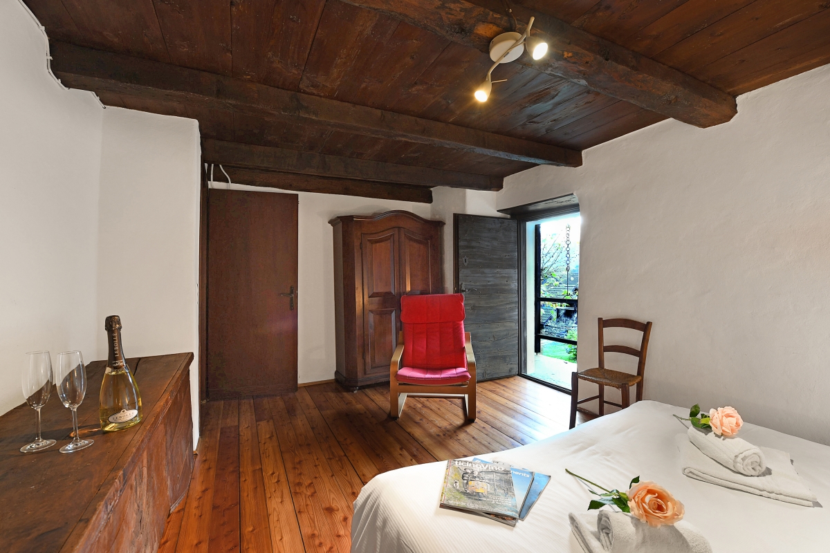 Bedroom 1: The cosy master bedroom, on the first floor, is reached via a staircase from the living room. It is furnished with a double bed, armchair and an attractive antique wardrobe. A door opens directly onto the balcony overlooking the garden.