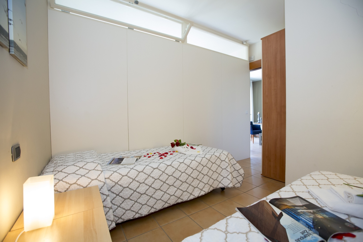 Inside, the air-conditioned apartment comprises a spacious open-plan living room with a double sofa bed, a modern kitchenette with a dining area and balcony access. A master bedroom with a double bed, wardrobe and balcony is complemented by a second family room with bunk beds and a single bed (or 3 single beds) and wardrobe. A modern family bathroom suite with either bath or shower completes the internal layout.