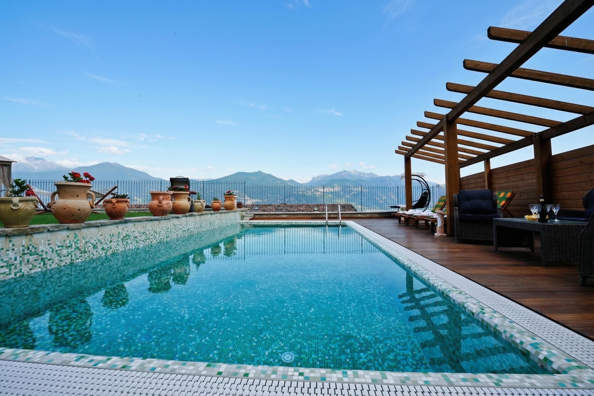 Outside, guests can enjoy a private garden with a sunny lawn and a covered poolside terrace. The private outdoor swimming pool (unheated) is surrounded by six sun loungers, offering a wonderful space to relax while taking in the lake views.