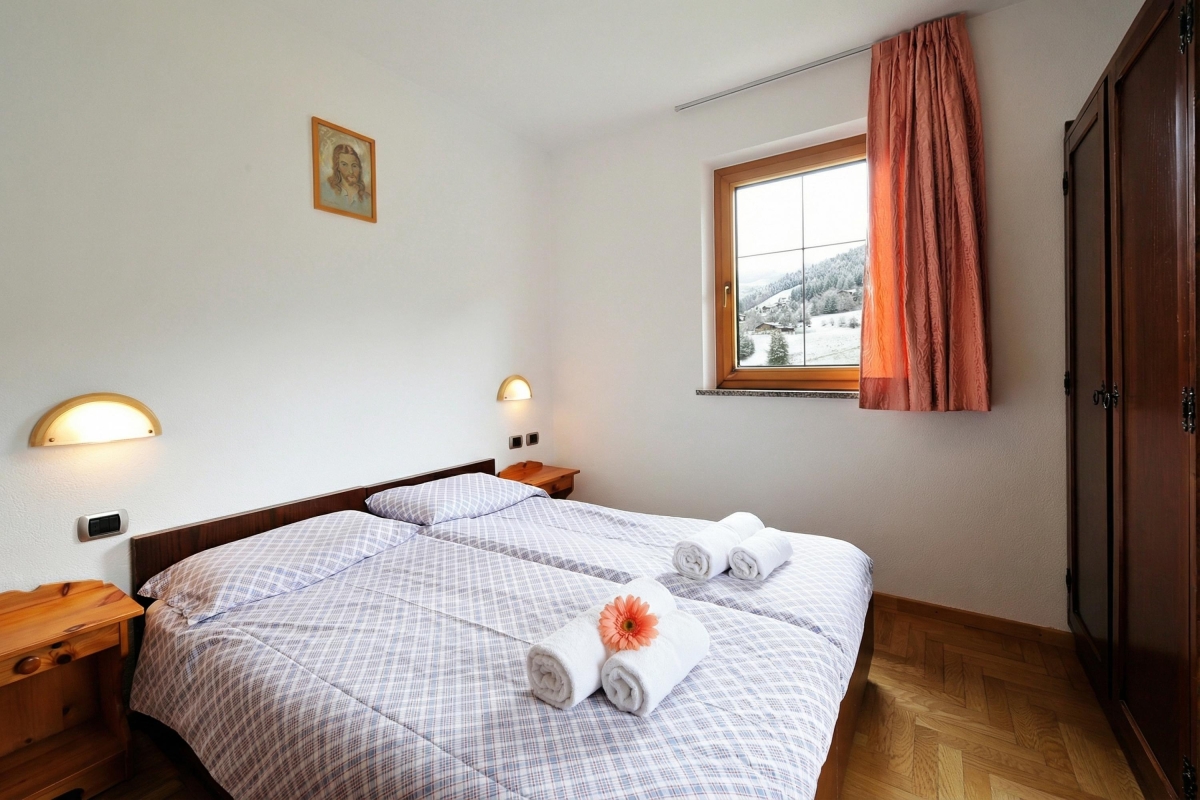 The property is situated to the ground floor and provides guests with the perfect place to rest and entertain with a large living and dining area with views to the beautiful outside alpine landscape and a wall mounted flat screen TV for guest’s entertainment. A fully fitted kitchen provides all the desired appliances including a hob, oven, dishwasher and more. Guests can enjoy splendid dinner parties here at the spacious dining area and the balcony is the perfect place to enjoy an aperitif before a delicious home cooked meal with family and friends.