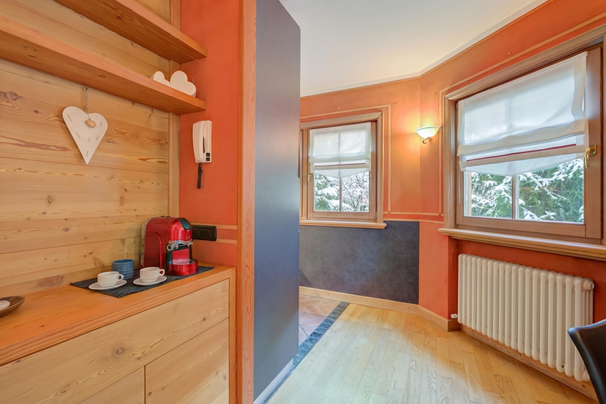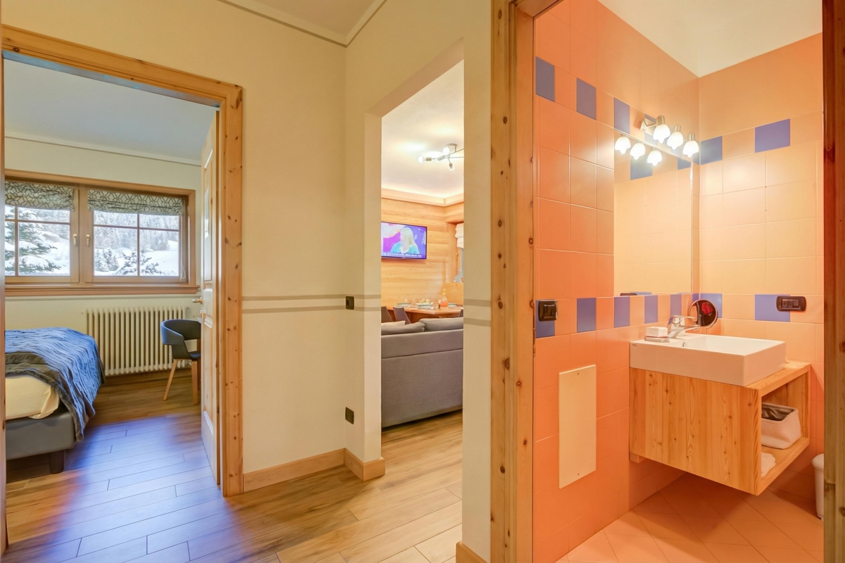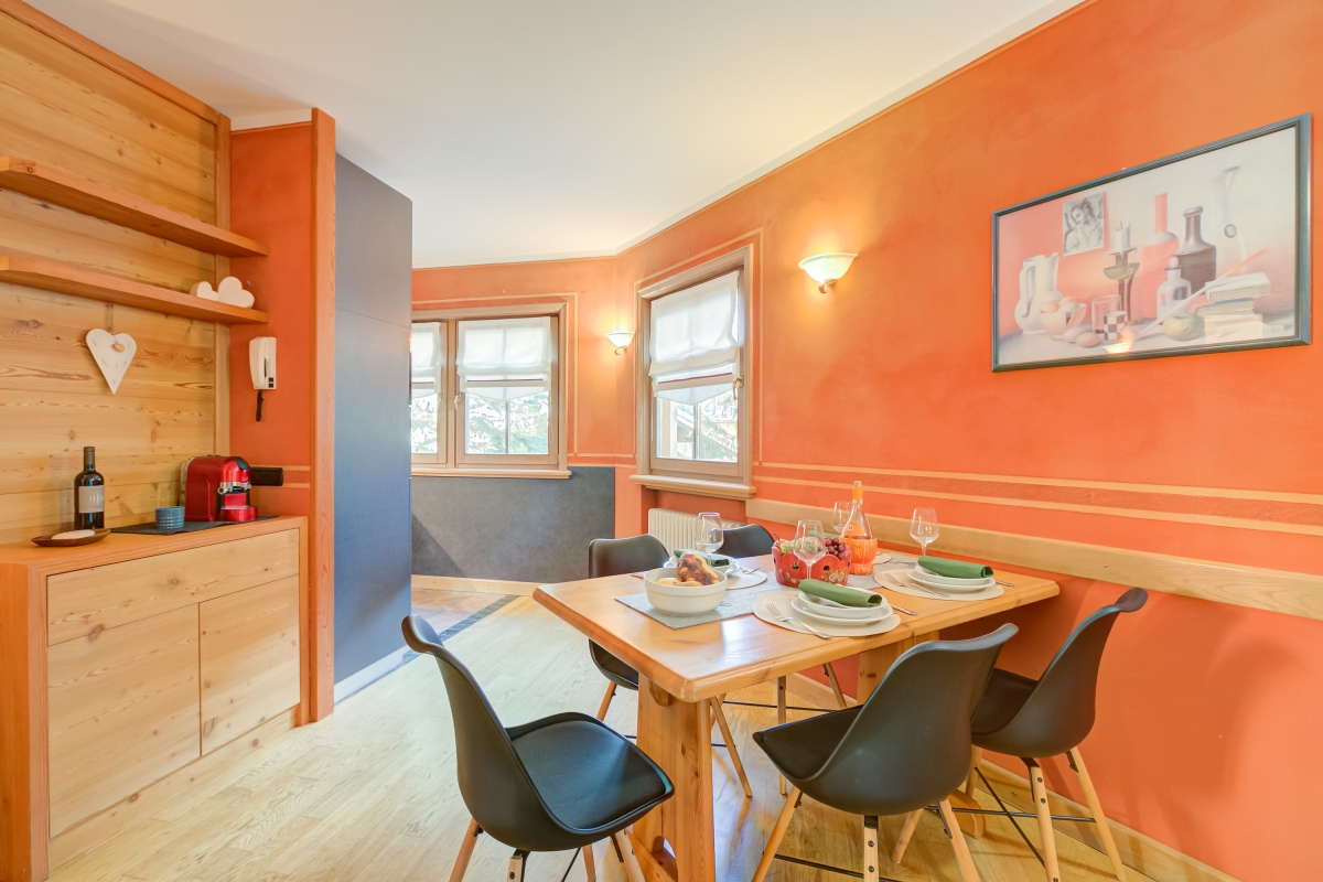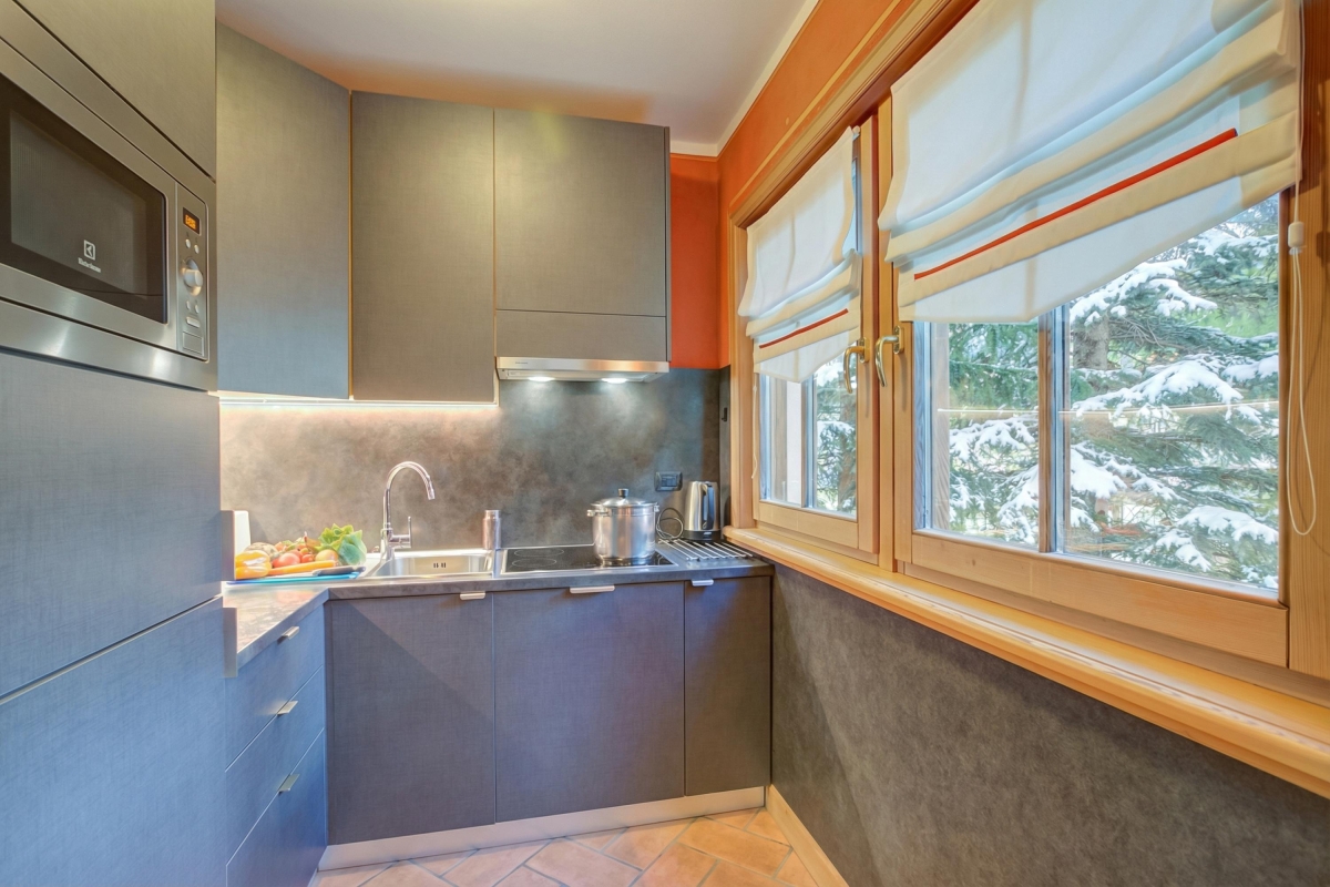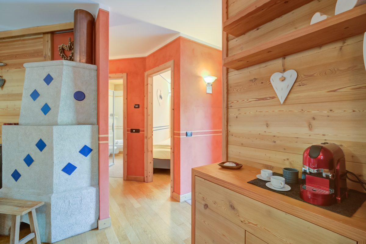 The beautiful accommodation is decorated in warm earthy tones with wooden flooring to add warmth and comfort, with a spacious and inviting living area with a sofa, a flat screen TV and wonderful fireplace to warm up by when returning from a day’s skiing! A pine dining area can comfortably sit up to 6 for intimate and relaxed dinner parties. A spacious fully fitted kitchen provides all the desired appliances for a carefree self-catering stay with a cooker hob, kettle, coffee maker, microwave and dishwasher.