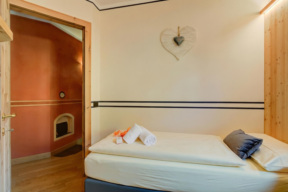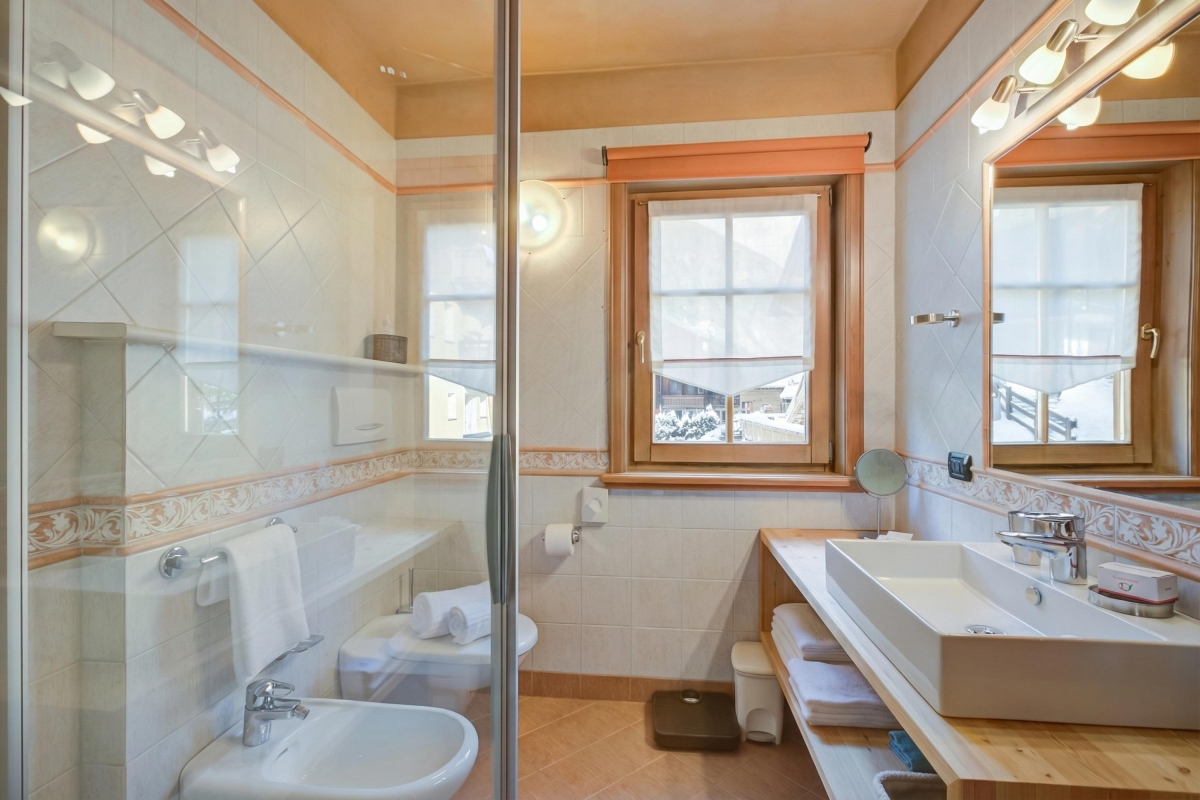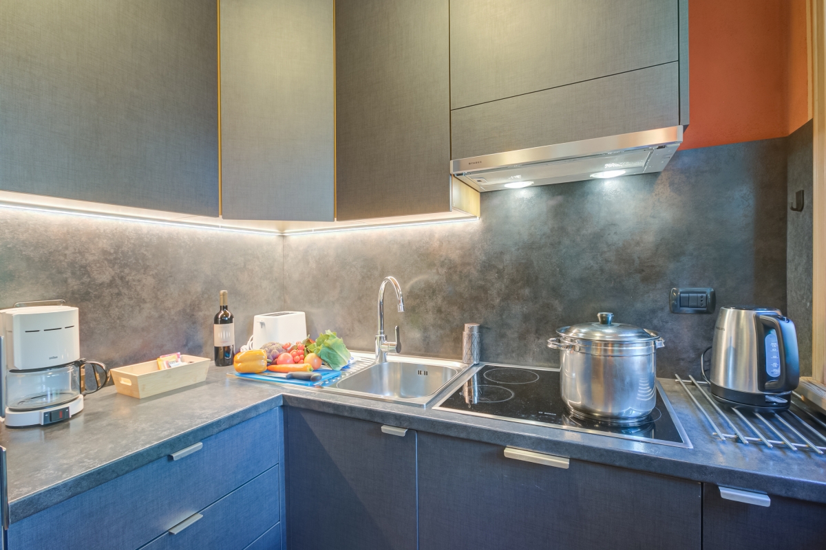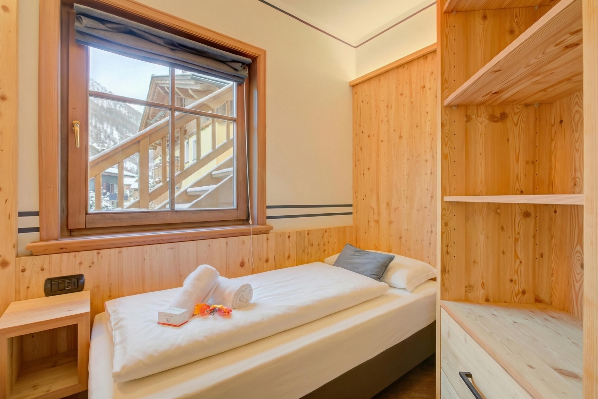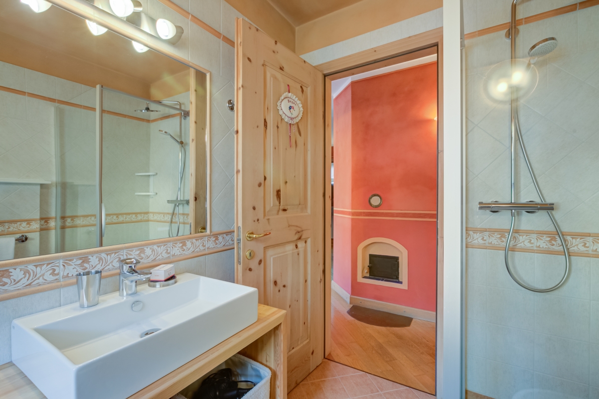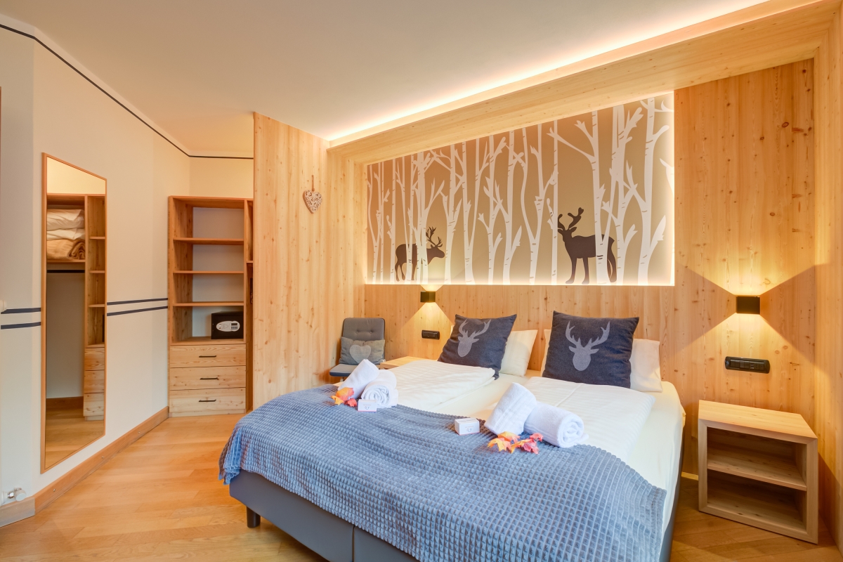 The beautiful accommodation is decorated in warm earthy tones with wooden flooring to add warmth and comfort, with a spacious and inviting living area with a sofa, a flat screen TV and wonderful fireplace to warm up by when returning from a day’s skiing! A pine dining area can comfortably sit up to 6 for intimate and relaxed dinner parties. A spacious fully fitted kitchen provides all the desired appliances for a carefree self-catering stay with a cooker hob, kettle, coffee maker, microwave and dishwasher.